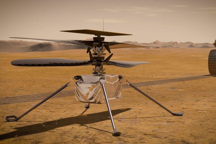 El pequeño helicóptero Ingenuity pesa 4 libras (2 kilogramos) y se encuentra actualmente guardado en el interior del Perseverance.