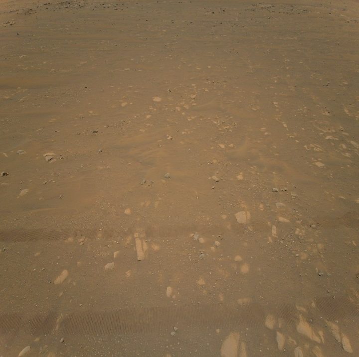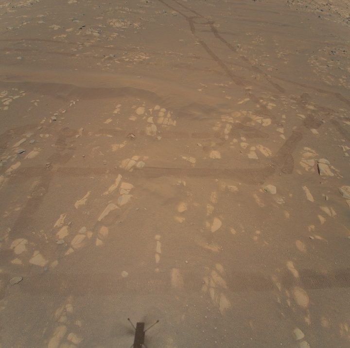 De acuerdo con la NASA, el helicóptero estaba a 5.2 metros sobre la superficie de Marte. La instantánea también muestra las huellas dejadas por el rover Perseverance.