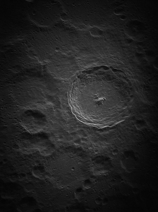 La zona fotografiada es el cráter Tycho, el cual es uno de los más luminosos de la Luna con un diámetro de 85km y una profundidad de 4.400 metros en su punto más bajo.