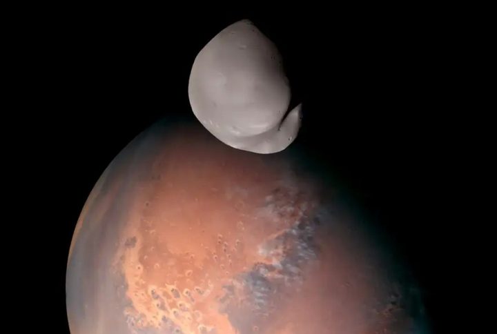 Una impresionante foto de la luna marciana Deimos es la que nos entregó el orbitador Hope de los Emiratos Árabes Unidos, parte de la Misión Emirates Mars (EMM), ya que sobrevoló a tan sólo 100 kilómetros del satélite del Planeta Rojo.