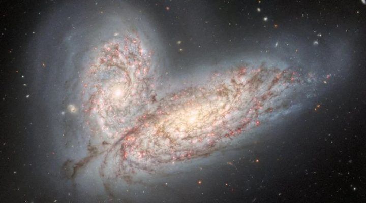 La colisión de estas dos enormes galaxias espirales ubicadas a unos 60 millones de años luz de la Tierra, en el cúmulo de Virgo, es lo que ha generado esta bella imagen.