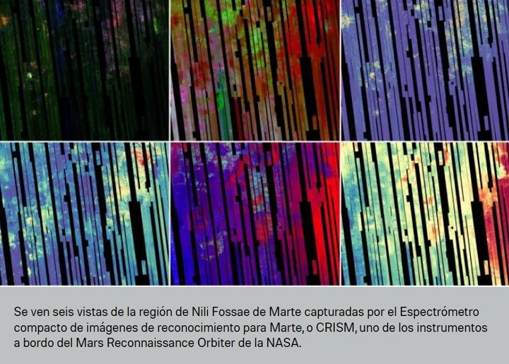 Las imágenes de color arco iris pueden parecer algún tipo de arte digital, pero de hecho, son mapas de Marte, tomados utilizando el Espectrómetro de Imágenes de Reconocimiento Compacto para Marte, o CRISM, un instrumento a bordo del Mars Reconnaissance Orbiter (MRO) de la NASA.