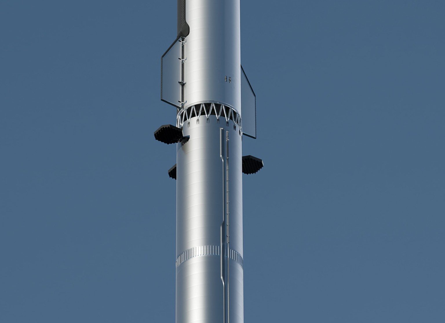 El nuevo diseño significa que el propulsor de 233 pies de altura (71 metros) ahora estará equipado con tres aletas de rejilla en lugar de cuatro, lo que permitirá que el propulsor descienda en ángulos de ataque más altos a medida que aterriza en la torre de lanzamiento poco después de desplegar la nave espacial Starship en órbita. Puedes verlos unidos al cohete en la imagen de abajo: