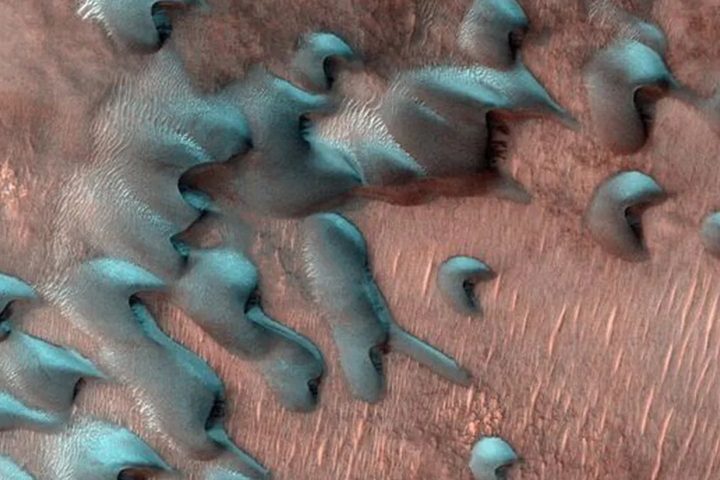 Con la cámara HiRISE a bordo del Mars Reconnaissance Orbiter se capturaron imágenes de dunas de arena cubiertas por escarcha justo después del solsticio de invierno. La escarcha aquí es una mezcla de hielo de dióxido de carbono (seco) y hielo de agua y desaparecerá en unos meses cuando llegue la primavera.