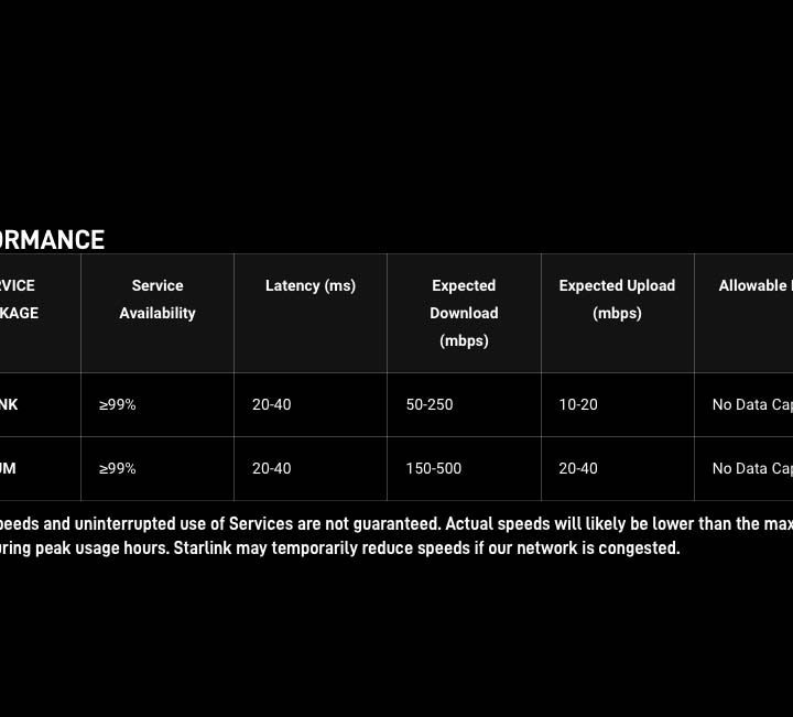 De acuerdo con Elon Musk, este servicio incluye una antena más grande de alto rendimiento y anuncia velocidades de entre 150 y 500 Mbps (latencia de 20 a 40 ms), por sobre los 50 a 250 Mbps (latencia de 20 a 40 ms) ofrecidos por su servicio estándar.