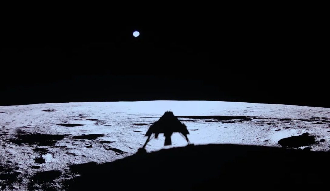 Además de una imagen impactante que muestra la sombra del módulo de aterrizaje en la superficie de la luna, vista arriba, otra imagen muestra el módulo de aterrizaje en la luna con la Tierra visible en el cielo nocturno: