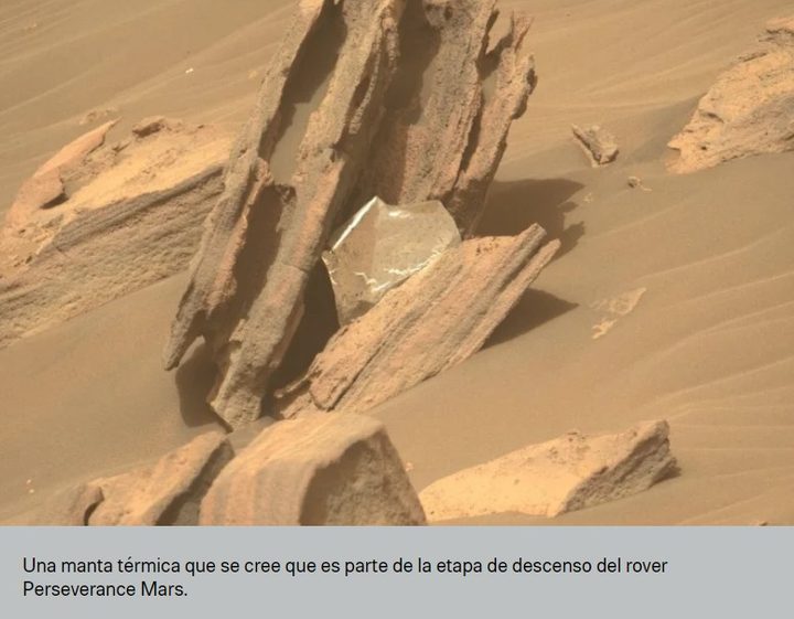 “Mi equipo ha detectado algo inesperado”, decía un mensaje en la cuenta de Twitter de Perseverance. “Es un pedazo de una manta térmica que creen que puede haber venido de mi etapa de descenso, el jet pack propulsado por cohetes que me puso en marcha el día del aterrizaje en 2021”.