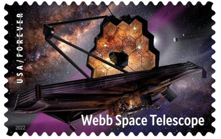 La imagen en el sello presenta la representación digitalmente creada por un artista del telescopio contra lo que el USPS describió como “un deslumbrante paisaje estelar”.