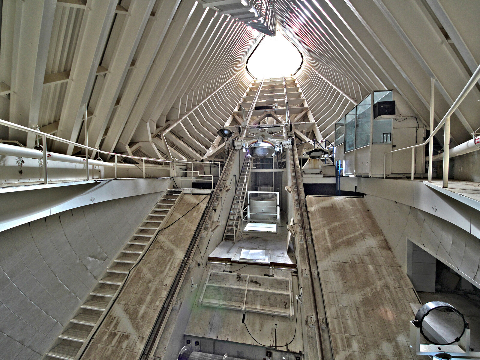 El telescopio es una estructura de 33 metros de alto por 7.9 de diámetro. Soporta un espejo que refleja la luz a través de un túnel óptico de concreto de 60 metros de largo.