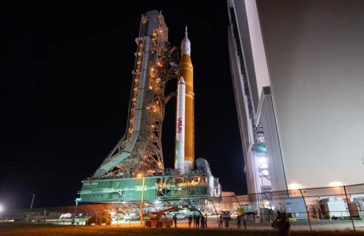 El viaje del martes vio al mega cohete lunar de la NASA arrastrarse a un ritmo similar a un caracol desde el Edificio de Ensamblaje de Vehículos del Centro Espacial Kennedy hasta la Plataforma de Lanzamiento 39B, cubriendo la ruta de cuatro millas en poco menos de 10 horas.