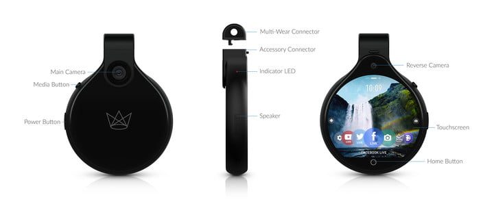 Así, la cámara FrontRow se parece a un reloj de bolsillo pero, en lugar de la esfera del reloj, cuenta con una pantalla circular de dos pulgadas.