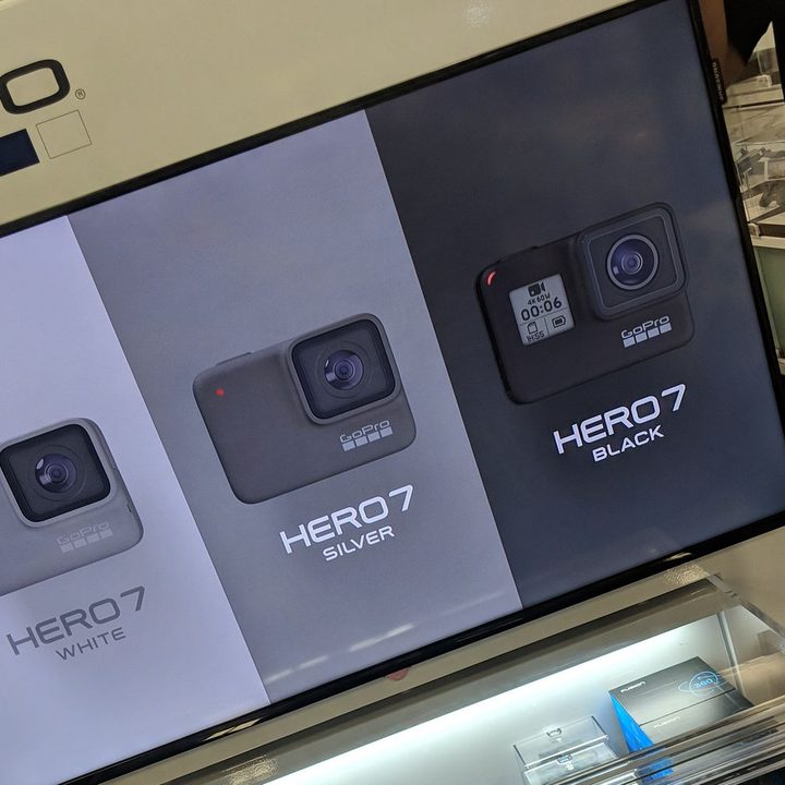 Esto de las filtraciones de nuevos equipos no deja de ser curioso: que si un móvil perdido en un bar, que si hojas técnicas del producto que terminan en blogs… pero GoPro nos ha enseñado que todavía se puede ir mucho más lejos en el arte de ‘filtrar’ nuevos productos: ¿qué te parece colocarlos directamente en una vitrina en un centro comercial? No, no es broma: ante el estupor de los presentes, la marca ha ubicado un hermoso expositor con la Hero 7 bien grande, para que no haya lugar a dudas.