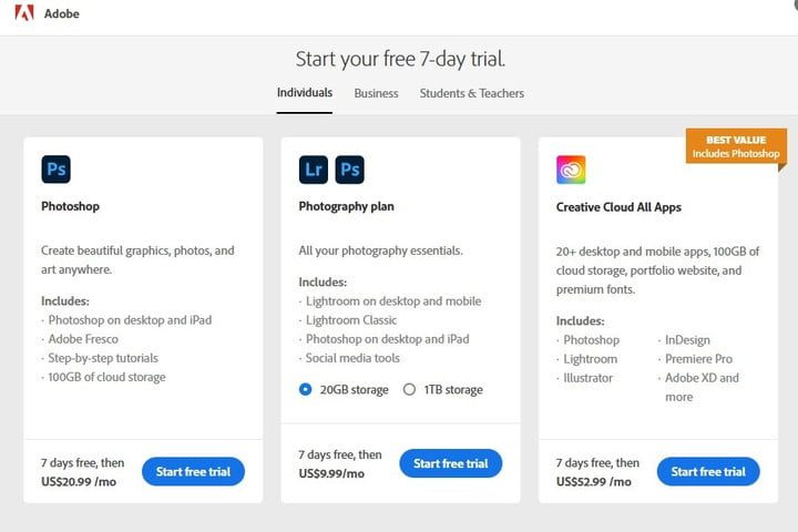 Paso 1: dirígete al sitio web de Adobe y selecciona Iniciar prueba gratuita cuando estés listo para comenzar. Adobe ofrecerá tres opciones de prueba gratuita.