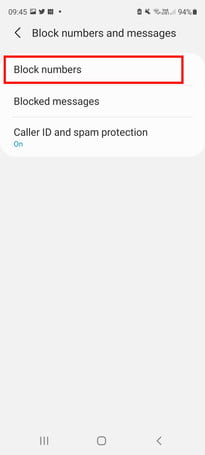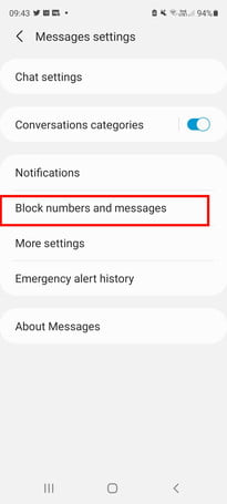 También puedes dirigirte a Mensajes> Más> Ajustes. Puntea en Bloquear mensajes para seleccionar la casilla de verificación y, a continuación, Bloquear lista. Desde aquí, ingresa manualmente el número del contacto y selecciona el signo + o elige dentro de tu bandeja de entrada o lista de contactos a la persona o contacto que quieres bloquear. Cuando hayas ingresado todos los números que quieras bloquear, toca la flecha hacia atrás.