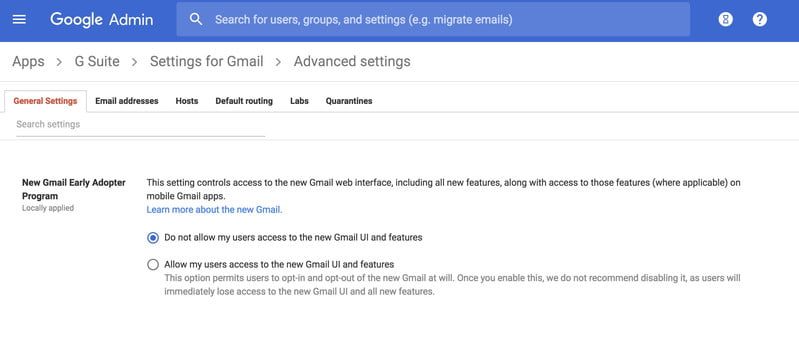 Desplázate hacia abajo hasta que veas la opción «Permitir que mis usuarios accedan a la nueva interfaz de usuario de Gmail y características nuevas». A continuación, haces clic en el pequeño botón radial, pulsas guardar y listo. Ahora, todos los usuarios de tu dominio de G Suite podrán acceder a Gmail y elegir la nueva versión.