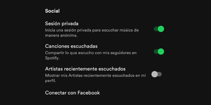 Si no quieres que nadie se entere de lo que estás reproduciendo en determinado momento (todos tenemos gustos culposos, ¿no?), ve a Configuración, y en la sección Social, activa Sesión privada. Lo que hace es que te permite escuchar música de manera anónima.