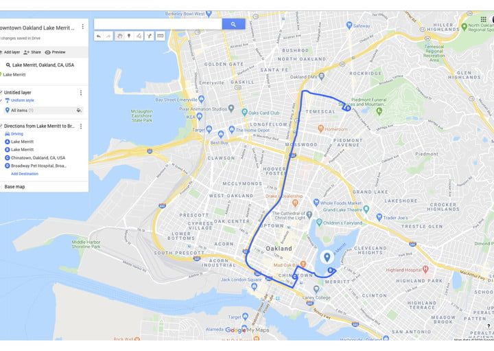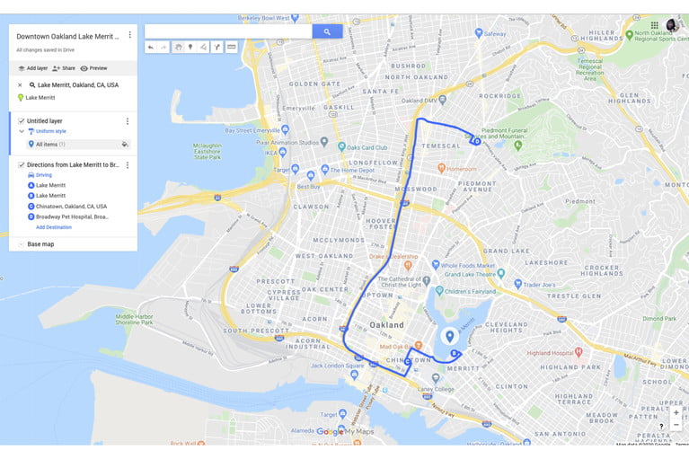 Deberías obtener un breve tutorial con sugerencias si es la primera vez que lo pruebas. Es fácil establecer una ubicación y marcar tus PDI y rutas, pero también puedes importar capas y datos, colorear diferentes áreas y rutas, y mucho más. Tus creaciones se guardan automáticamente en tu Google Drive, y puedes encontrarlas en la aplicación Google Maps en tu teléfono vía Mapas Guardados.