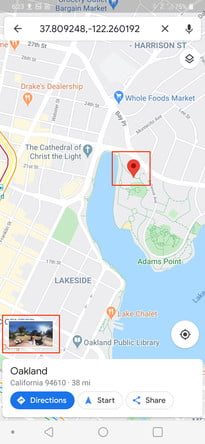 Si quieres ver una foto de tu ubicación, entonces necesitas Street View. Toca y mantén presionado en el mapa para colocar un pin en la ubicación elegida. Luego toca en la parte inferior de la dirección para expandir la información. Deberías ver una imagen o fotografía de la ubicación elegida en la parte inferior de la pantalla. Tócala, y la ubicación se abrirá en Street View. Puedes compartir esa Street View tocando el menú en la esquina superior derecha (los tres puntos en vertical) y tocando después Compartir.