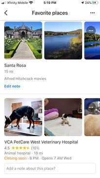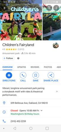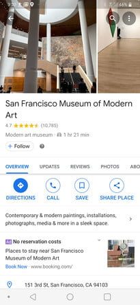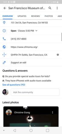 Cuando tocas en un lugar de interés en Google Maps, puede acceder al contenido de la pagina, la cual que incluye direcciones, un enlace para llamar, información básica, un enlace a su sitio web y, a menudo, algunas reseñas. Para lugares populares, también encontrarás una sección de Preguntas y respuestas, si te desplazas hacia abajo.