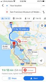 Debes evitar las líneas rojas; el naranja significa que está todo un poco congestionado, y el verde informa que hay tráfico expedito. También puedes verificar el tráfico cuando simplemente estás navegando. Si retrocedes a nuestro consejo anterior de cómo cambiar la forma de visionar, verás Tráfico como una opción que puedes superponer todo el tiempo.