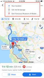 Algunos lugares en la ciudad pueden ser una pesadilla para estacionarse. Afortunadamente, Google Maps ofrece consejos de estacionamiento en algunos lugares. Si conectas tu ubicación y verificas la pantalla de Indicaciones, es posible que veas un icono P al lado de la hora y la distancia en la parte inferior.