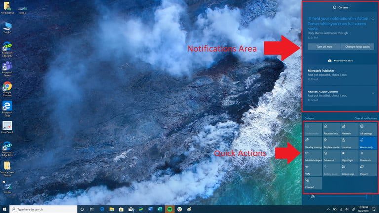 El tercer paso al aprender a usar Windows 10 es el Centro de acciones. Este es hogar de todas tus notificaciones y ajustes rápidos de Windows 10. Puedes abrirlo haciendo clic en él o presionando la Tecla de Windows + A.