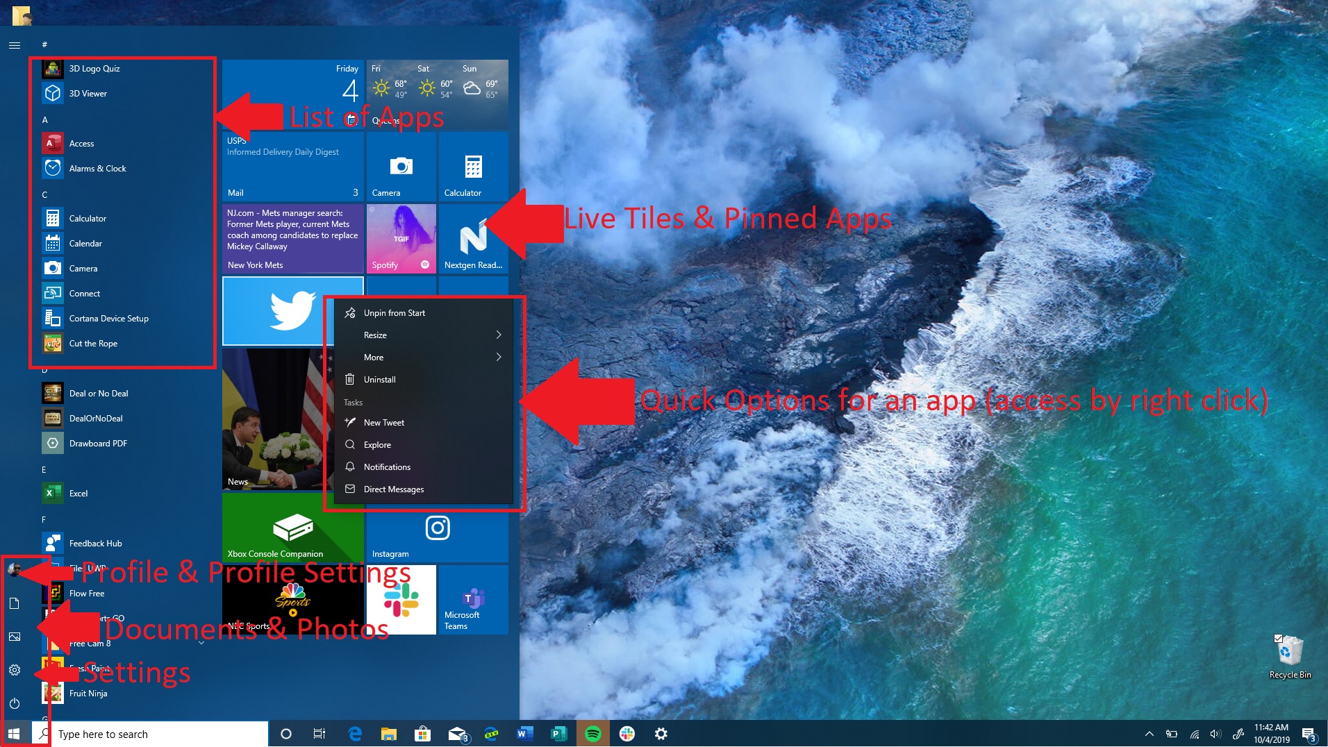 Puedes cambiar la aplicación de lugar dejando el botón presionado sobre ella y arrastrándola a donde quieras, o quítala de ahí haciendo clic con el botón derecho y escogiendo Desanclar de inicio. Algunas aplicaciones presentarán más opciones al hacer clic con el botón derecho; por ejemplo, con Twitter puedes crear un tuit.