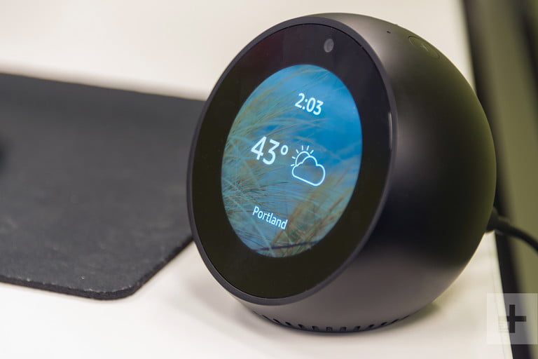 La pantalla de la Echo Spot es circular, y el dispositivo parece una esfera (solo la pantalla y la base son planas). Debido a su diseño redondeado, la Spot se ve más como un despertador de alta tecnología que como una pantalla inteligente. Viene en dos colores: blanco o negro.