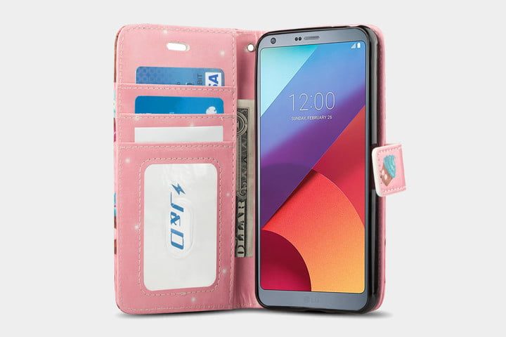 No necesitas gastar demasiado para obtener una funda atractiva para tu LG G6, a menos que la quieras en cuero real. Esta funda está hecha de poliuretano, y al abrirla encontramos tres ranuras para tarjetas. Hay una carcasa delgada de TPU para mantener el teléfono en su lugar, y puedes plegarla para sostenerlo en vista horizontal. Hay recortes que te permiten usar su teléfono con la funda puesta, pero usar el flash te causará problemas, ya que estos recortes son bastante justos. Esta funda también cuenta con un cierre magnético y una correa desmontable. Si no te gusta el diseño de cupcake, no te preocupes, que hay otros para elegir, incluidos negro, rojo, marrón.