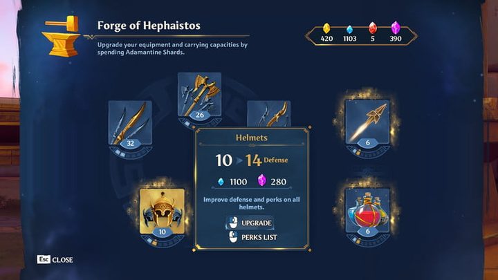En vez de encontrar nuevo equipamiento para hacerte más poderoso, necesitas mejorar el que ya tienes en la Fragua de Hefesto en el Salón de los Dioses. Mejorar una pieza de tu equipamiento hará que todos los otros dentro de esa categoría también lo hagan (todos tus cascos mejoran a la vez, por ejemplo). Las mejoras entregan ventajas adicionales a tu equipo, las cuales puedes encontrar en el menú de pausa.