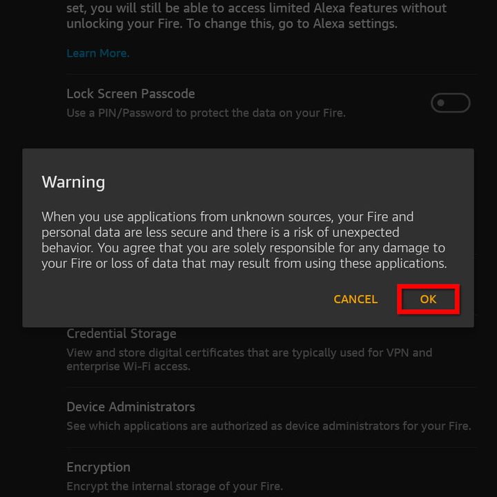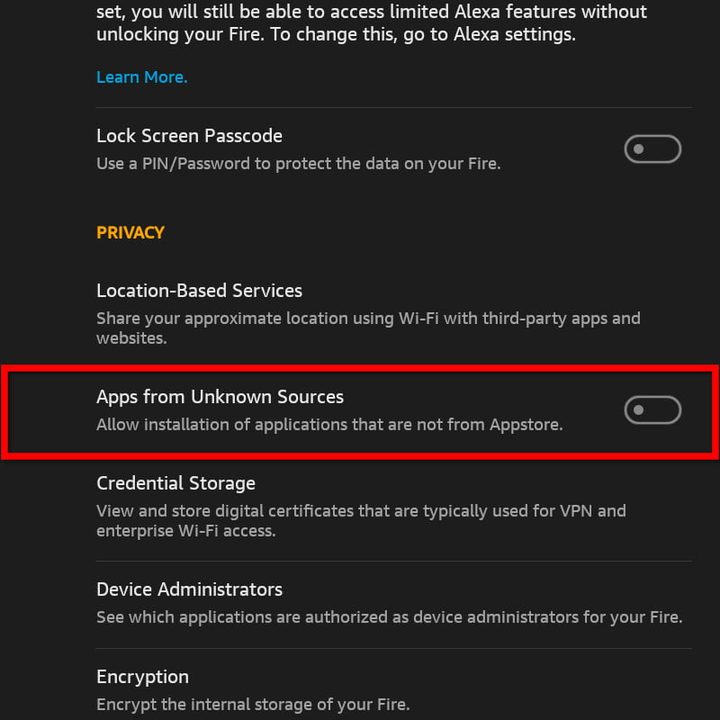 Paso 3: toca el interruptor junto a Aplicaciones de fuentes desconocidas para habilitar la descarga.