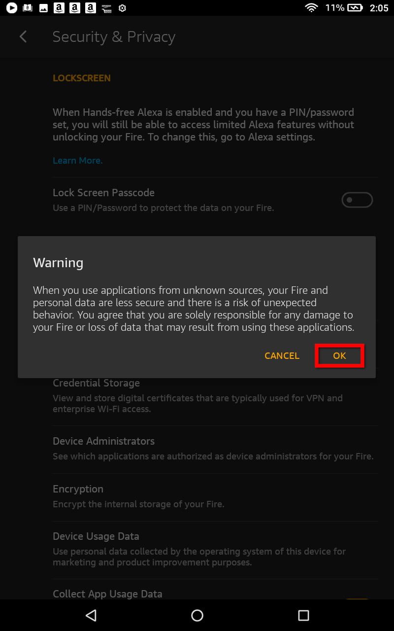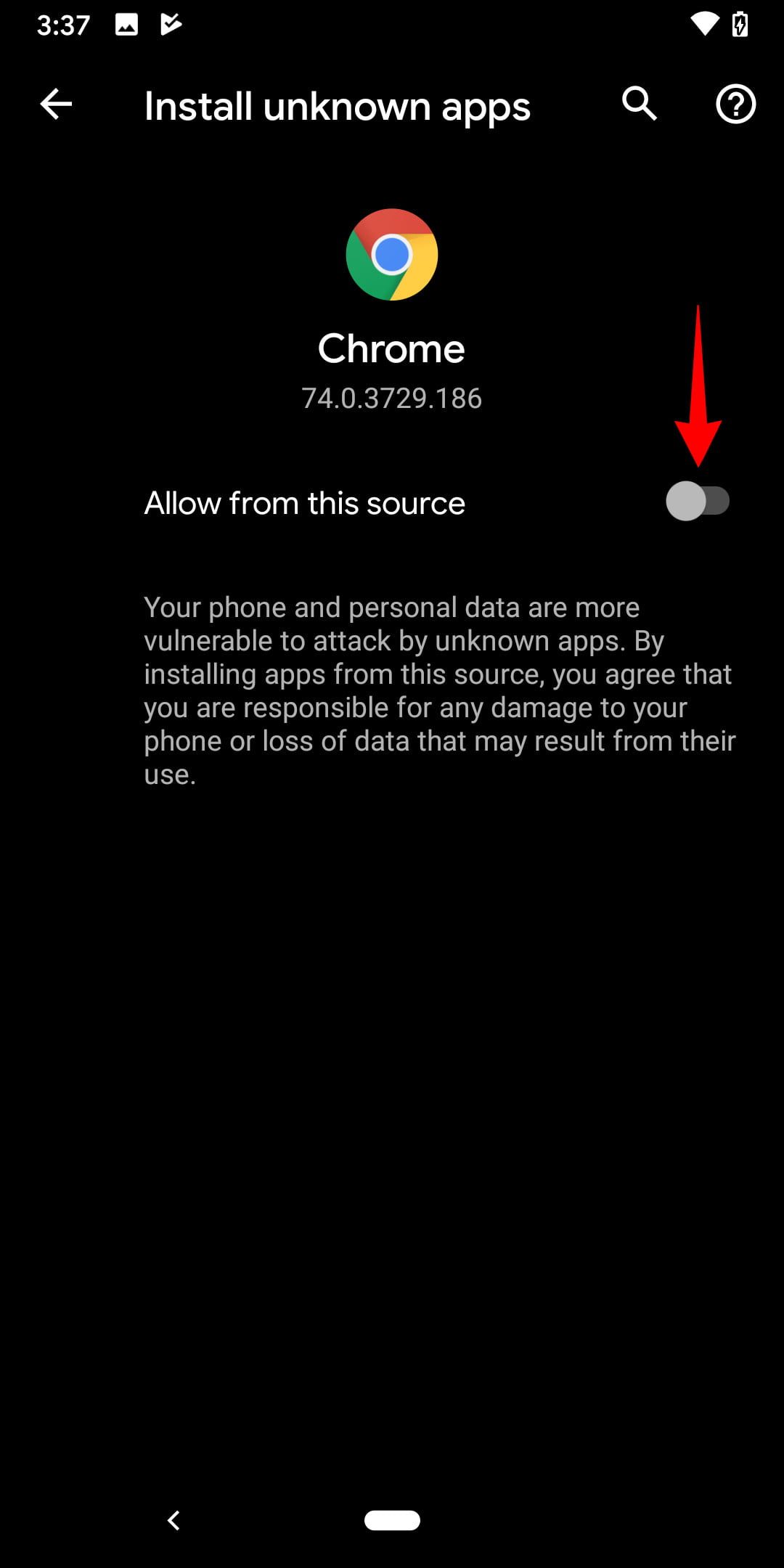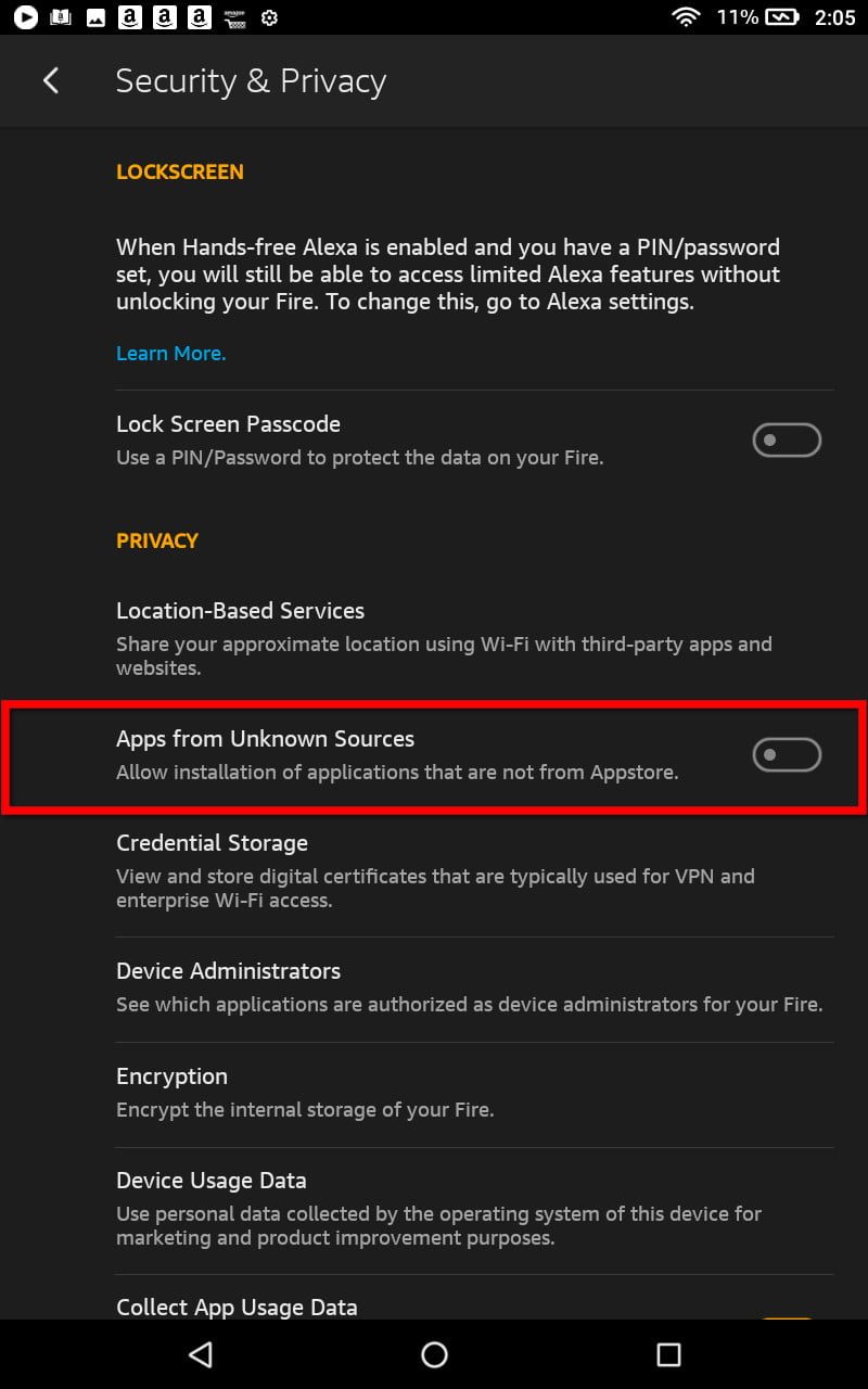 Paso 3: toca el interruptor junto a Aplicaciones de fuentes desconocidas para habilitar la descarga.
