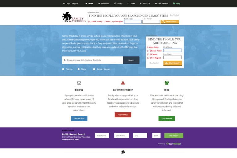 Family Watchdog es un sitio gratuito que te ayuda a localizar personas registradas como agresores sexuales en tu área (dentro de Estados Unidos). El sitio mostrará un mapa con los infractores cercanos. Puedes ver su información básica, direcciones, cargos, señas personales y sobrenombres.