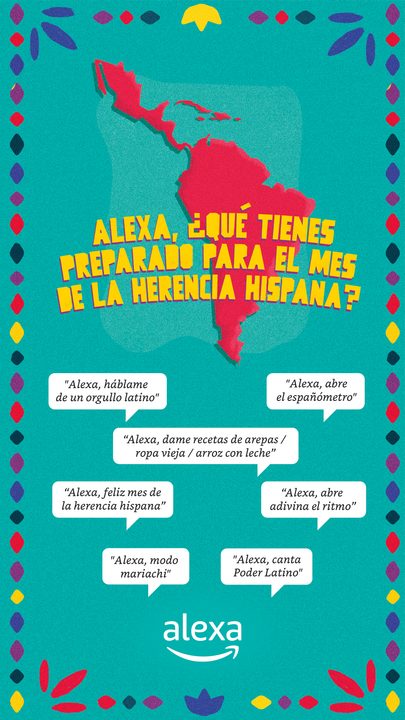 Si quieres saber qué experiencias tiene Alexa preparadas, tan solo di “Alexa, ¿qué tienes preparado para el mes de la Herencia Hispana?” para descubrirlo. De igual manera, Alexa te compartirá biografías cortas de atletas, celebridades, músicos entre otros perfiles hispanos que han sobresalido por sus logros en los Estados Unidos. Usa la frase “Alexa, háblame de un orgullo latino” o “Alexa, ¿quién te inspira?”