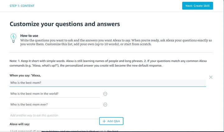 Por ejemplo, la asistente de Amazon aún no tiene la facultad de reconocer todos los nombres y apellidos existentes. Por tal razón, si piensas utilizar un BluePrint para hacer un juego de preguntas familiares, lo más recomendable es colocarle un nombre más general, como «The Family Fun Quiz» en lugar de «The Alexander Family’s Quiz». Alexa también te permite enunciar ciertas palabras (como «nuestro»), así que tenlo en cuenta al elegir un nombre también.