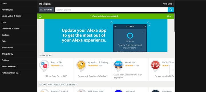 Puedes comenzar a interactuar con la habilidad utilizando el comando de voz «Alexa, abrir [nombre de habilidad]». Después de activar la habilidad, puedes empezar a usarla, para asegurarte de que funciona como esperabas. Si no es así, puedes realizar cambios en la sección Skills You’ve Made.