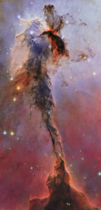 Los diferentes colores de la imagen representan diferentes elementos que están presentes en la nebulosa. Los tonos azules del fondo provienen del oxígeno ionizado, mientras que los colores rojos de la parte inferior de la imagen provienen del hidrógeno. Sin embargo, la estructura oscura que se ve aquí no durará para siempre, ya que la radiación de las estrellas jóvenes brillantes eventualmente erosionará el pilar.