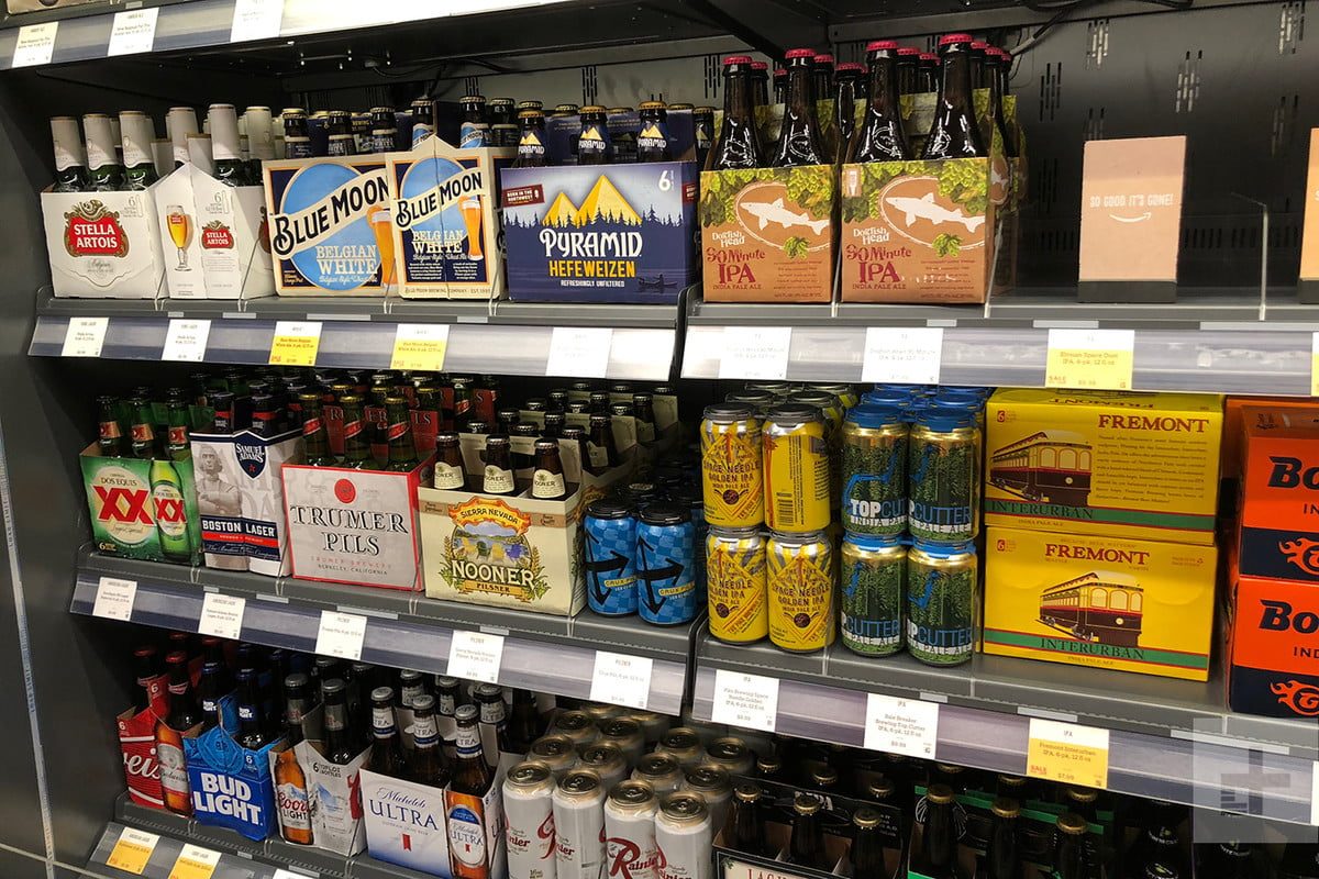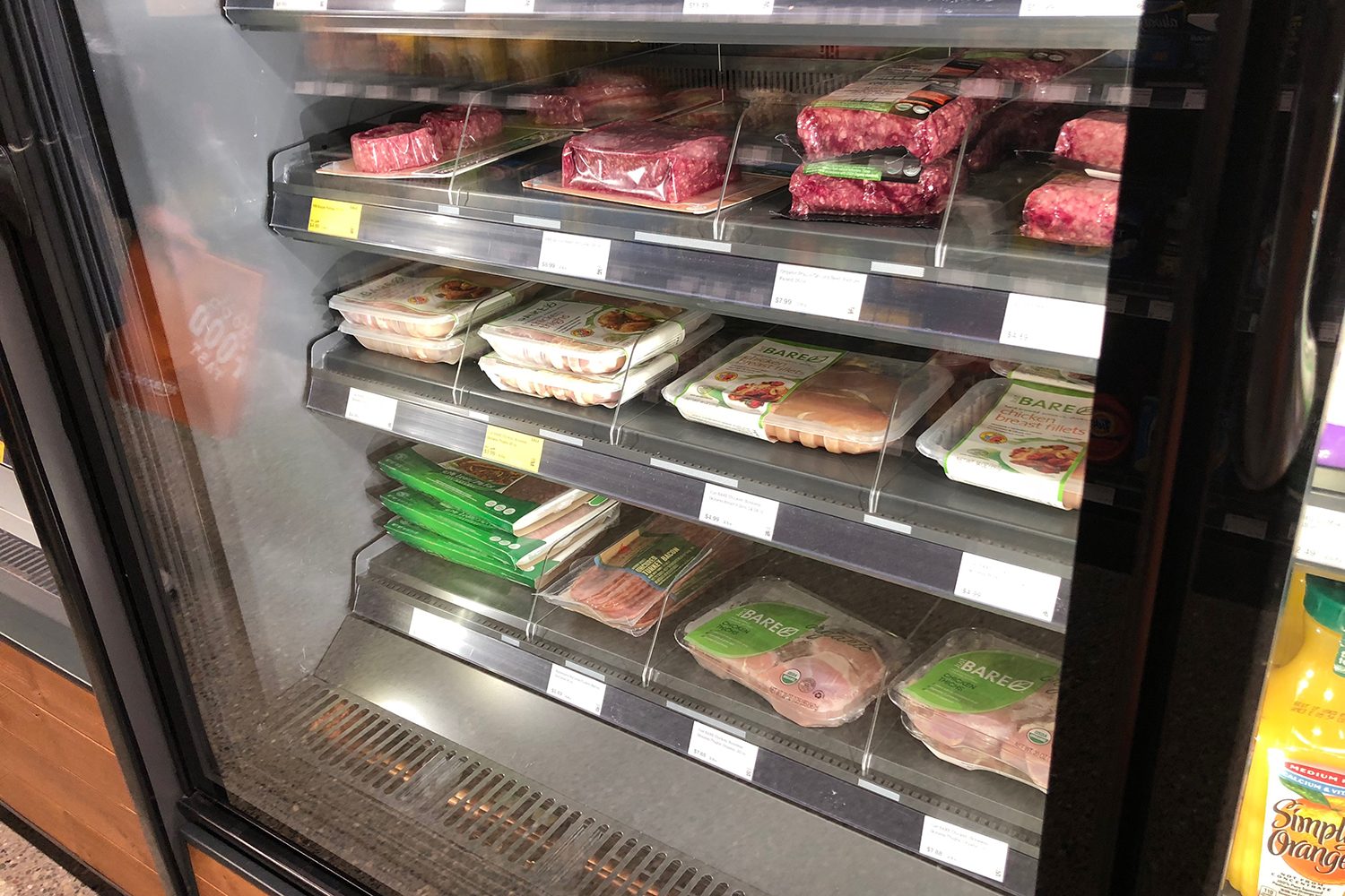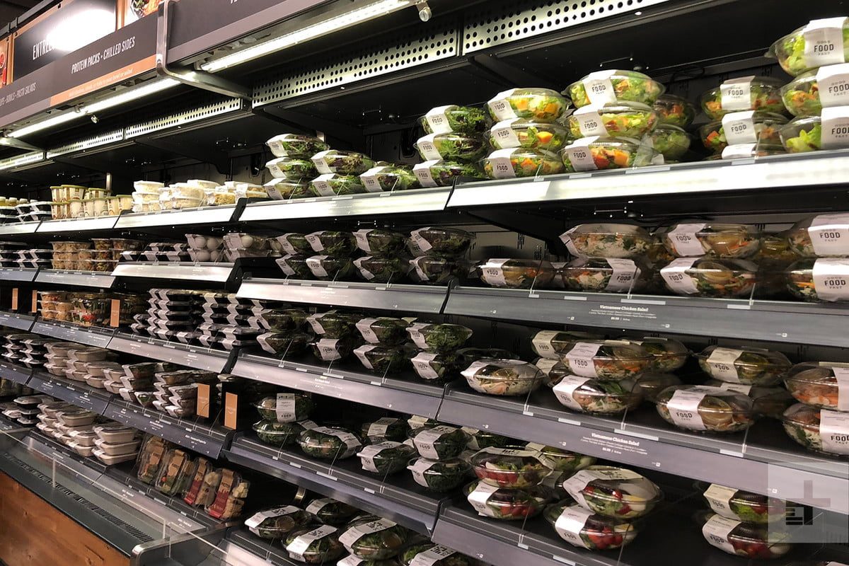 Lo primero que veo es una pared de comida preparada, para llevar, como sándwiches, ensaladas y pastas. Una ensalada con trozos de carne cuesta $9 dólares. El rollo de atún cuesta $6. Nada barato. Amazon es dueño de Whole Foods, y los precios no están fuera de línea con esas tiendas. El enfriador de bebidas está lleno de productos de Coca Cola, y toneladas de opciones de agua con gas. Latas de La Croix están a la venta por 89 centavos de dólar.