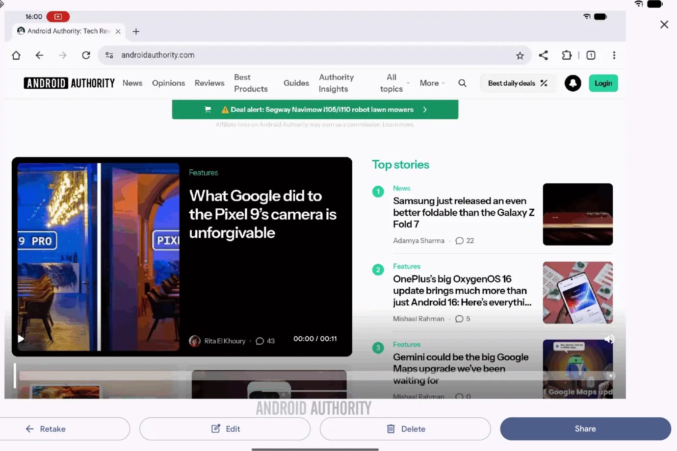 - Además, se está agregando una pantalla posterior a la captura, con un reproductor de video y opciones para volver a tomar, editar, eliminar o compartir la grabación de pantalla.