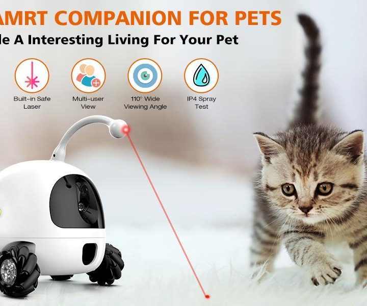 Esta cámara es una de las mejores para rastrear los movimientos de tu animal de compañía. Esto se debe a que tiene ruedas, lo que le permite moverse con tu mascota, jugar con ella y darle golosinas. La cámara se puede inclinar hacia arriba y hacia abajo y ofrece un movimiento de 360 grados. Otras características incluyen audio bidireccional, visión nocturna y un juguete láser interactivo.