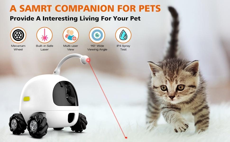 Esta cámara es una de las mejores para rastrear los movimientos de tu animal de compañía. Esto se debe a que tiene ruedas, lo que le permite moverse con tu mascota, jugar con ella y darle golosinas. La cámara se puede inclinar hacia arriba y hacia abajo y ofrece un movimiento de 360 grados. Otras características incluyen audio bidireccional, visión nocturna y un juguete láser interactivo.