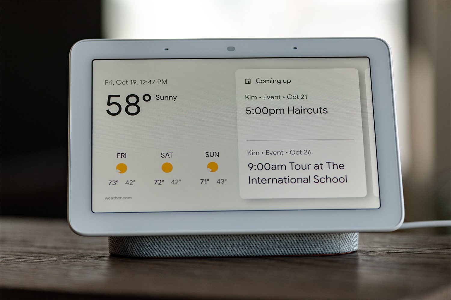 También hay otros usos. Si tienes cualquier cámara compatible conectada al dispositivo, puedes ver sus imágenes en el Google Home Hub. También puedes responder al timbre de tu puerta Nest Hello, completo con comunicación bidireccional. Debido a que el Asistente de Google ya está conectado a Gmail, Google Calendar, Google Maps y otras plataformas de Google, la integración con lo que ya estás usando es perfecta. Por ejemplo, cuando configuramos nuestro Home Hub, Google ya nos conocía en función de nuestra cuenta y nuestro uso, y por lo tanto, los avisos del calendario y el clima para mañana aparecieron automáticamente en nuestra pantalla de inicio. Si eso no te gusta, puedes personalizar lo que ves.
