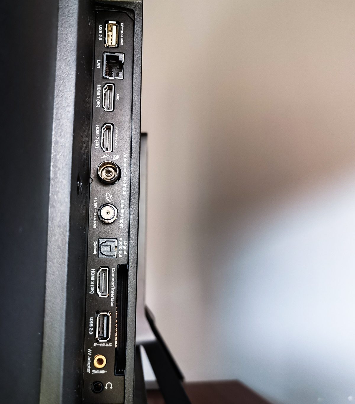 En cuanto a conexiones, dispone de todo lo que puedes necesitar: tres HDMI 2.0b, dos USB, Ethernet y puerto para auriculares. Todas se encuentran en el lado izquierdo de la parte trasera de la televisión.
