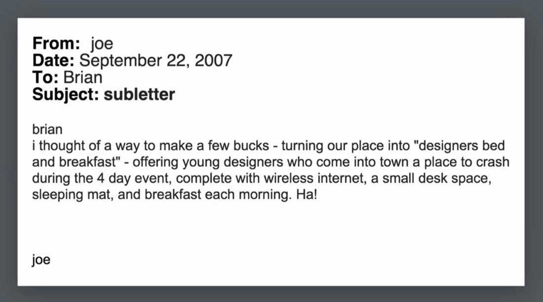 Iba para “Bread & Breakfast”, pero no tardó mucho en convertirse en uno de los negocios más boyantes de Silicon Valley. Como buena parte de algunos proyectos de estas características, la historia de Airbnb es casi el relato de un accidente que convirtió en millonarios a sus creadores. El 27 de septiembre de 2007, cuando Joe Gebbia escribió un breve email a su compañero de piso, Brian Chesky: