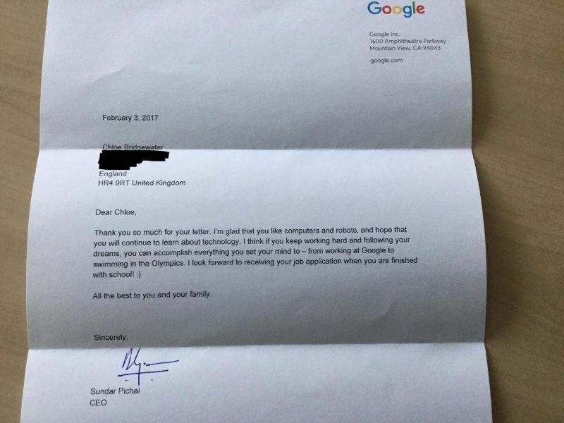 En la carta, escrita con su puño y letra, la niña le dice a Pichai: “Mi nombre es Chloe y cuando sea grande quisiera un trabajo en Google. También quiero trabajar en una fábrica de chocolates y nadar en las Olimpiadas.” Continúa contándole: “Me gustan las computadoras y también tengo una tableta donde juego. Mi papá me dio un juego donde tengo que mover un robot hacia arriba y abajo en unos cubos, y también me dijo que sería muy bueno si yo aprendiera a cerca de las computadoras. Tengo 7 años y mis maestros siempre le dicen a mi mamá y papá que soy muy buena en las clases.”