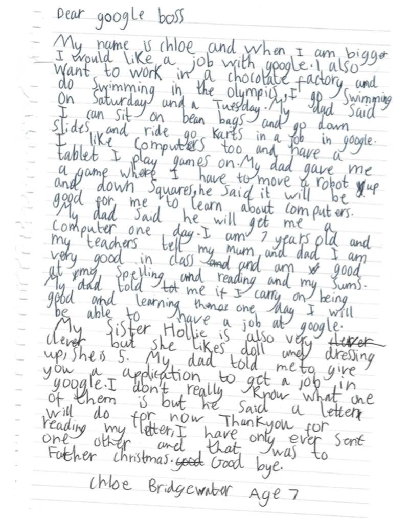 La niña también menciona en la carta que sus padres le dijeron que si continúa estudiando podría llegar a conseguir el trabajo que quisiera, y cuando ella expresó interés en Google, le explicaron que para conseguir un empleo las personas tienen que llenar una aplicación. De una manera tierna e inocente, ella explica: “…la verdad es que no entiendo qué es una aplicación o cómo se hace eso, pero creo que una carta tendrá que ser suficiente por ahora, así que gracias por leer mi carta. Esta es solo la segunda carta que escribo, la primera la mandé a Santa Claus.”