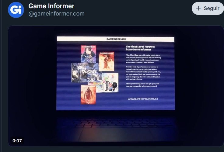 Algo está sucediendo con Game Informer el 25 de marzo, pero no está claro qué es ese algo. Justo después del mediodía de hoy, se publicó un video en las páginas oficiales de Game Informer que mostraba el mensaje de despedida de la revista, seguido de un fundido a negro que terminaba con el texto «25 de marzo de 2025».