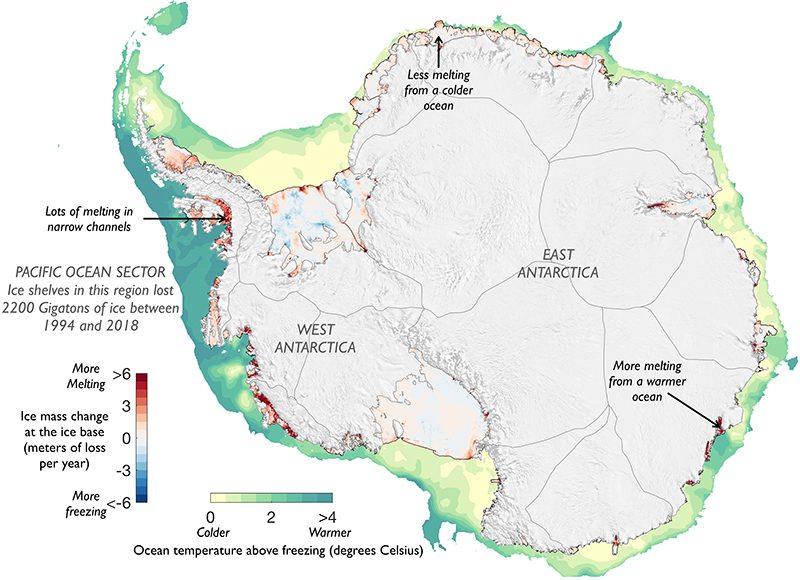 El registro de 25 años mostró que “hay mucha variación alrededor del continente blanco la velocidad a la que el océano está derritiendo las plataformas de hielo, pero en total, hay más pérdida que ganancia de masa de la plataforma de hielo”.