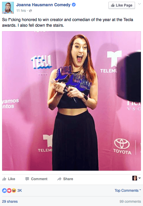 La gran ganadora de la noche fue la comediante Joanna Hausmann, cuyos comentarios y videos en las redes sociales sobre la idiosincrasia latinoamericana con humor son todo un éxito. Hausmman se llevó a casa los premios como Comediante del Año y Creadora de Contenido del Año. Igualmente, The Flama, donde Hausmann es productora y escritora, obtuvo el premio a la mejor Página Latina de Facebook.