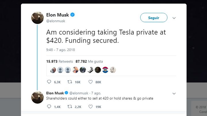 La demanda presentada ante la corte del distrito federal en el Distrito Sur de Nueva York alude al anuncio realizado a través de Twitter por el también cofundador de la compañía sobre que ésta dejaría de transar sus títulos en el mercado bursátil.